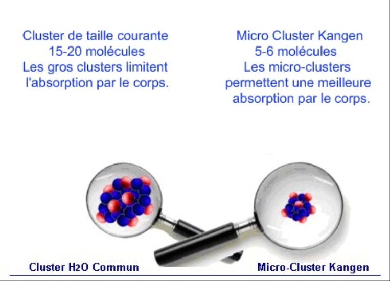 L'eau Kangen est regroupée par paquets de 6 molécules. Ceci permet une absorption beaucoup plus facile et ainsi une meilleure hydratation des cellules de notre corps.